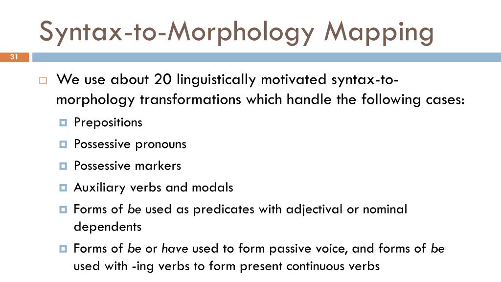 Syntax-to-Morphology Mapping • We use about 20 linguistically motivated syntax-to-morphology transformations which handle the following cases: • Prepositions • Possessive pronouns • Possessive markers • Auxiliary verbs and modals • Forms of be used as predicates with adjectival or nominal dependents • Forms of be or have used to form passive voice, and forms of be used with -ing verbs to form present continuous verbs • Various adverbial clauses formed with if, while, when, etc. • Prepositional phrases with date constructions