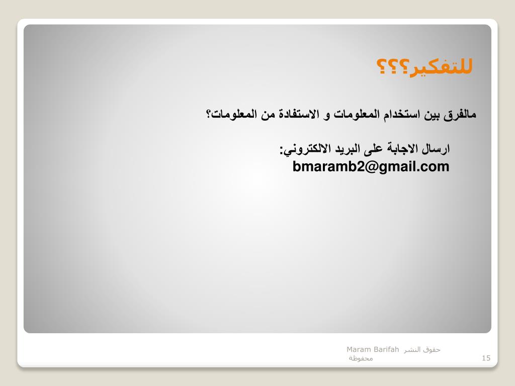 للتفكير؟؟؟ مالفرق بين استخدام المعلومات و الاستفادة من المعلومات؟ارسال الاجابة على البريد الالكتروني:bmaramb2@gmail.com Maram Barifah حقوق النشر محفوظة