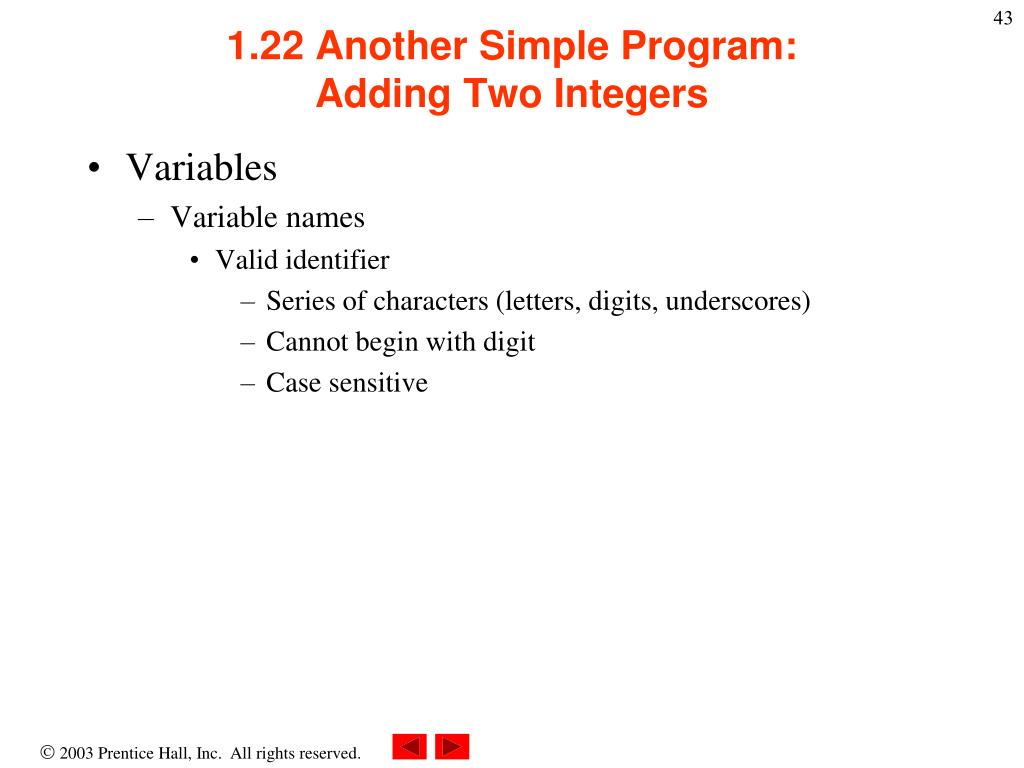 1.22 Another Simple Program:Adding Two Integers • Variables • Variable names • Valid identifier • Series of characters (letters, digits, underscores) • Cannot begin with digit • Case sensitive