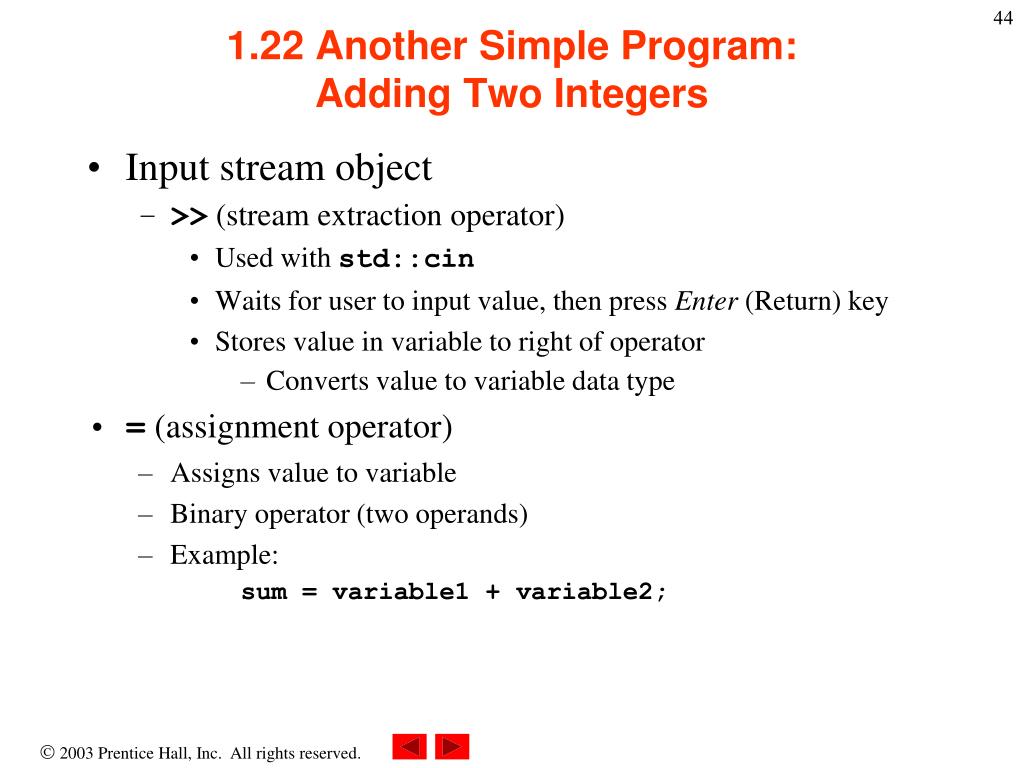1.22 Another Simple Program:Adding Two Integers • Input stream object • >> (stream extraction operator) • Used with std::cin • Waits for user to input value, then press Enter (Return) key • Stores value in variable to right of operator • Converts value to variable data type • = (assignment operator) • Assigns value to variable • Binary operator (two operands) • Example: sum = variable1 + variable2;