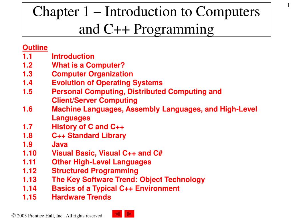 Chapter 1 – Introduction to Computers and C++ Programming Outline1.1 Introduction1.2 What is a Computer?1.3 Computer Organization1.4 Evolution of Operating Systems1.5 Personal Computing, Distributed Computing and Client/Server Computing1.6 Machine Languages, Assembly Languages, and High-Level Languages1.7 History of C and C++1.8 C++ Standard Library1.9 Java1.10 Visual Basic, Visual C++ and C#1.11 Other High-Level Languages1.12 Structured Programming1.13 The Key Software Trend: Object Technology1.14 Basics of a Typical C++ Environment1.15 Hardware Trends