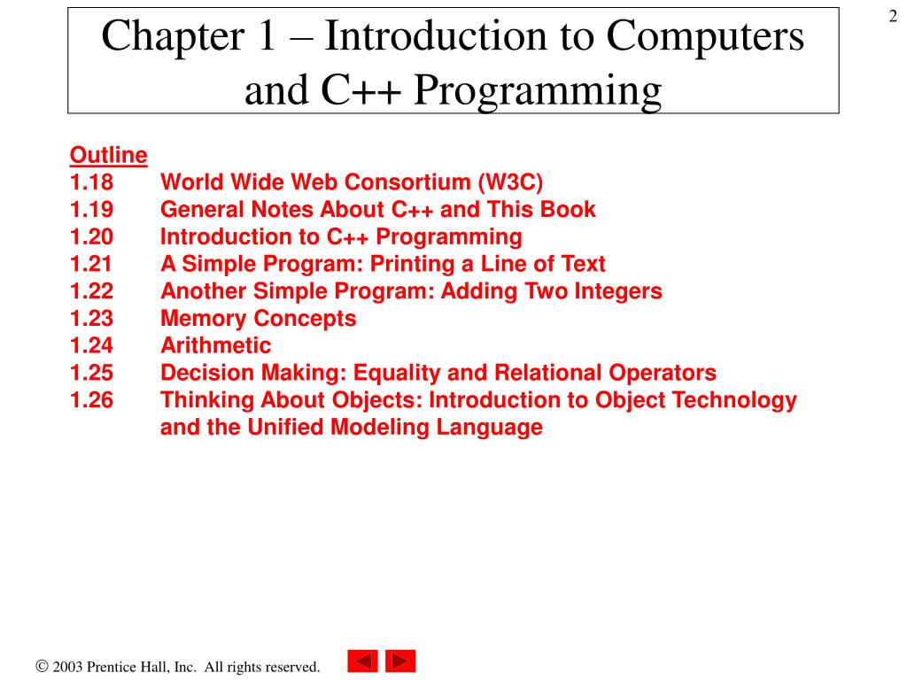 Chapter 1 – Introduction to Computers and C++ Programming Outline1.18 World Wide Web Consortium (W3C)1.19 General Notes About C++ and This Book1.20 Introduction to C++ Programming1.21 A Simple Program: Printing a Line of Text1.22 Another Simple Program: Adding Two Integers1.23 Memory Concepts1.24 Arithmetic1.25 Decision Making: Equality and Relational Operators1.26 Thinking About Objects: Introduction to Object Technology and the Unified Modeling Language