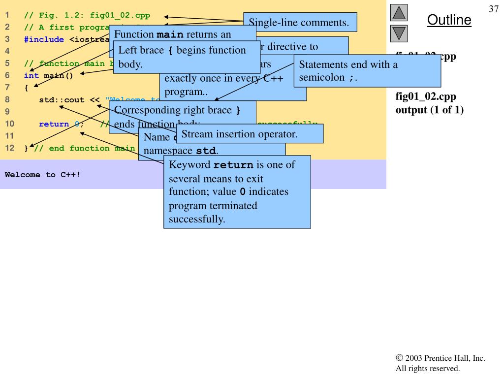 1 // Fig. 1.2: fig01_02.cpp 2 // A first program in C++. 3 #include <iostream> 4 5 // function main begins program execution 6 int main() 7 { 8 std::cout << "Welcome to C++!\n"; 9 10 return0; // indicate that program ended successfully 11 12 } // end function main Function main returns an integer value. Preprocessor directive to include input/output stream header file <iostream>. Left brace { begins function body. Function main appears exactly once in every C++ program.. Statements end with a semicolon ;. Corresponding right brace } ends function body. Stream insertion operator. Single-line comments. Name cout belongs to namespace std. Keyword return is one of several means to exit function; value 0 indicates program terminated successfully. fig01_02.cpp(1 of 1)fig01_02.cppoutput (1 of 1) Welcome to C++!
