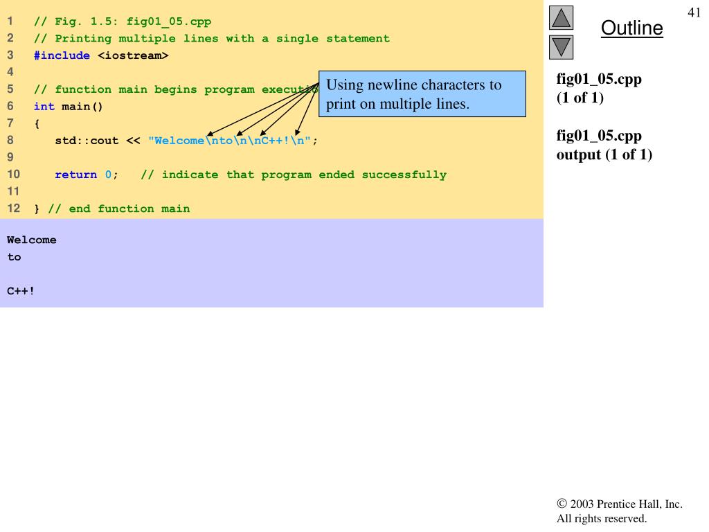 1 // Fig. 1.4: fig01_04.cpp 2 // Printing a line with multiple statements. 3 #include <iostream> 4 5 // function main begins program execution 6 int main() 7 { 8 std::cout << "Welcome "; 9 std::cout << "to C++!\n"; 10 11 return0; // indicate that program ended successfully 12 13 } // end function main Multiple stream insertion statements produce one line of output. fig01_04.cpp(1 of 1)fig01_04.cppoutput (1 of 1) Welcome to C++!