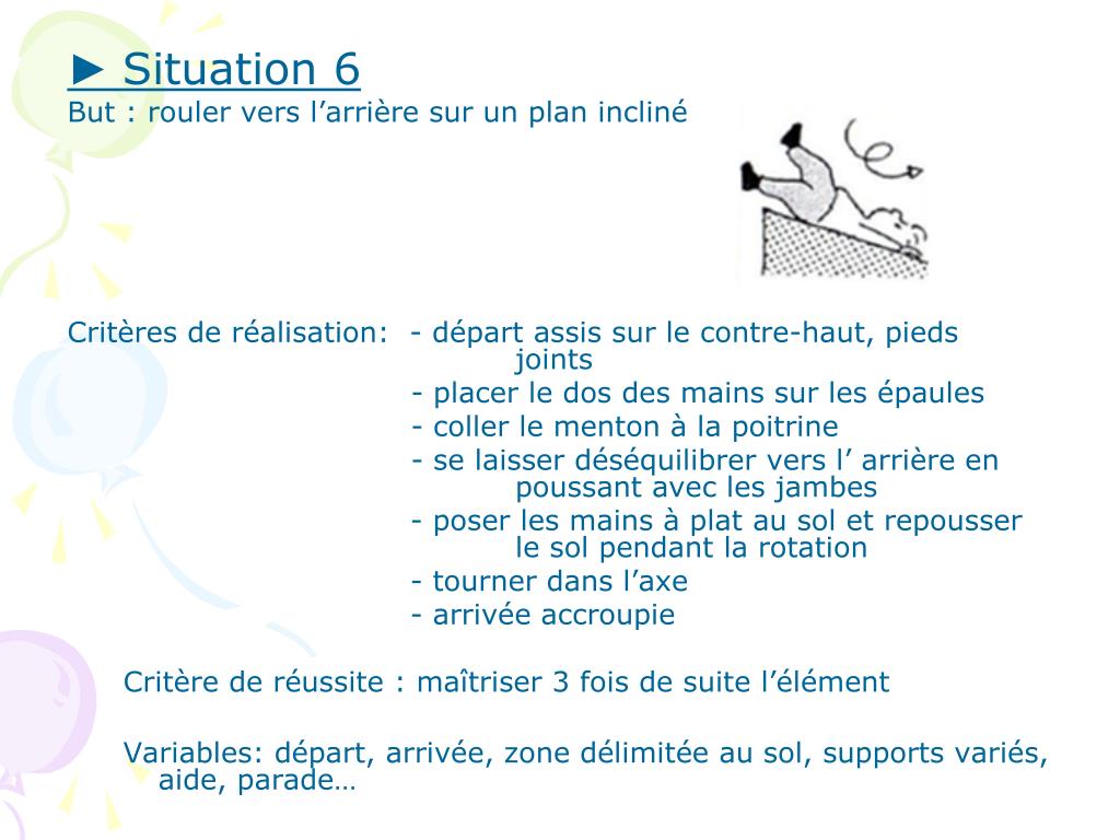 ► Situation 6 But : rouler vers l’arrière sur un plan incliné Critères de réalisation: - départ assis sur le contre-haut, pieds joints - placer le dos des mains sur les épaules - coller le menton à la poitrine - se laisser déséquilibrer vers l’ arrière en poussant avec les jambes - poser les mains à plat au sol et repousser le sol pendant la rotation - tourner dans l’axe - arrivée accroupie Critère de réussite : maîtriser 3 fois de suite l’élément Variables: départ, arrivée, zone délimitée au sol, supports variés, aide, parade…