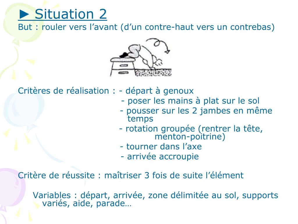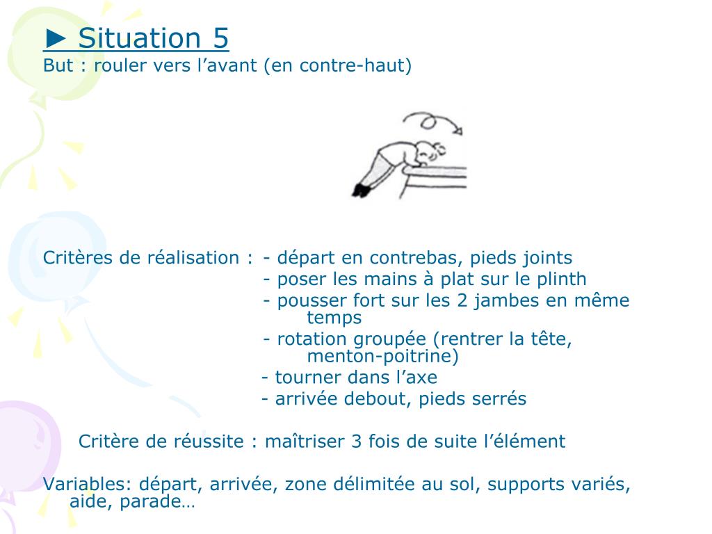 ► Situation 4 But : rouler vers l’avant (au sol) Critères de réalisation: - départ accroupi, pieds joints - poser les mains à plat au sol - rotation groupée (rentrer la tête menton-poitrine) - pousser sur les 2 jambes en même temps - tourner dans l’axe - arrivée accroupie Critère de réussite : maîtriser 3 fois de suite l’élément Variables: départ, arrivée, zone délimitée au sol, supports variés, aide, parade…
