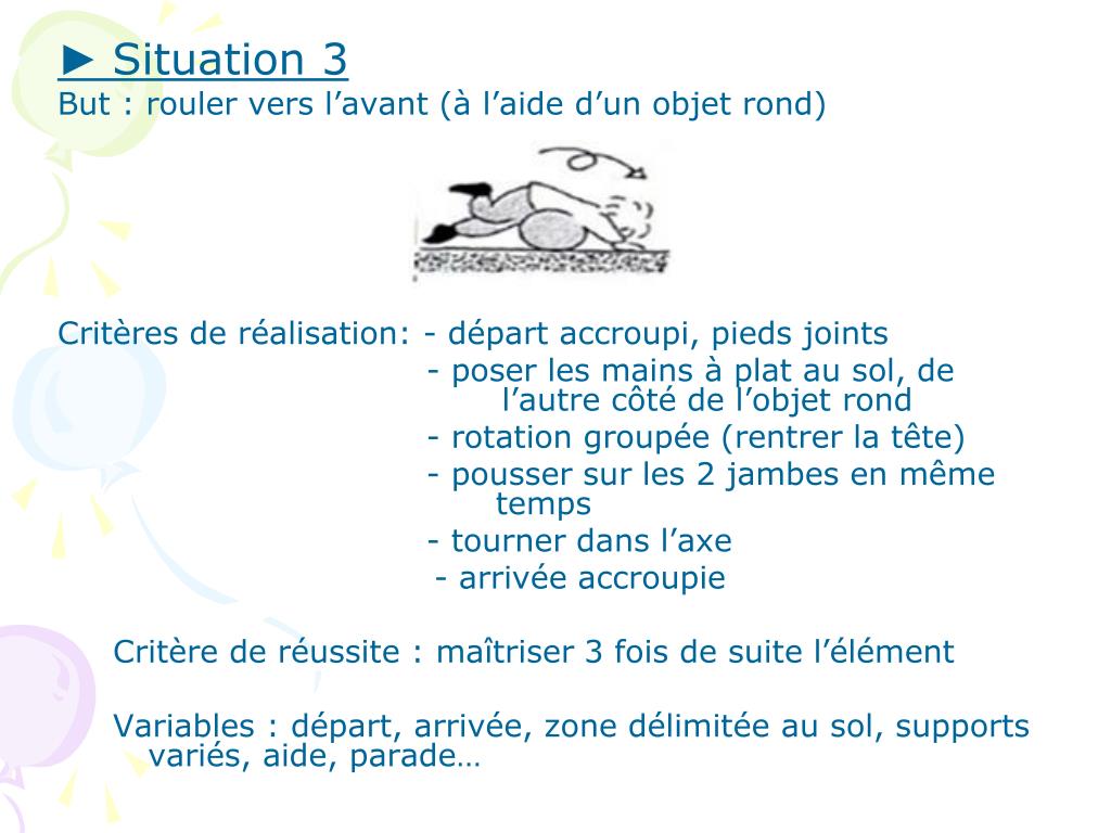 ► Situation 3 But : rouler vers l’avant (à l’aide d’un objet rond) Critères de réalisation: - départ accroupi, pieds joints - poser les mains à plat au sol, de l’autre côté de l’objet rond - rotation groupée (rentrer la tête) - pousser sur les 2 jambes en même temps - tourner dans l’axe - arrivée accroupie Critère de réussite : maîtriser 3 fois de suite l’élément Variables : départ, arrivée, zone délimitée au sol, supports variés, aide, parade…