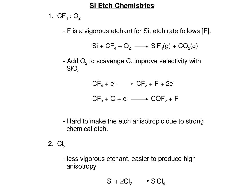 Composition of Typical Wet Etches • Wet etches are typically composed of several components to increase the control of the process. These parts include • oxidizing agent • oxide etchant • diluent (typically H2O) • These break the overall etch into a two-step process rather than a single step. This permits a higher degree of control of the etch by independently controlling the 2 steps. • This is seen in simple cleanup solutions like piranha: • To etch organic materials (photoresist), simple H2SO4 could be used but this creates C contaminant released into the solution. • Instead, piranha (mixture of H2SO4:H2O2:H2O) is used to produce a clean etch result.