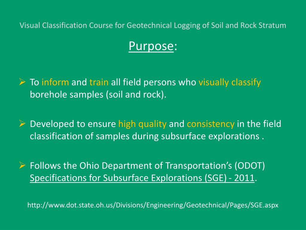 Ohio Department of Transportation. Visual Classification Course for Geotechnical Logging of Soil and Rock Stratum. Office of Geotechnical Engineering. Visual Classification Course for Geotechnical Logging of Soil and Rock Stratum. Purpose :