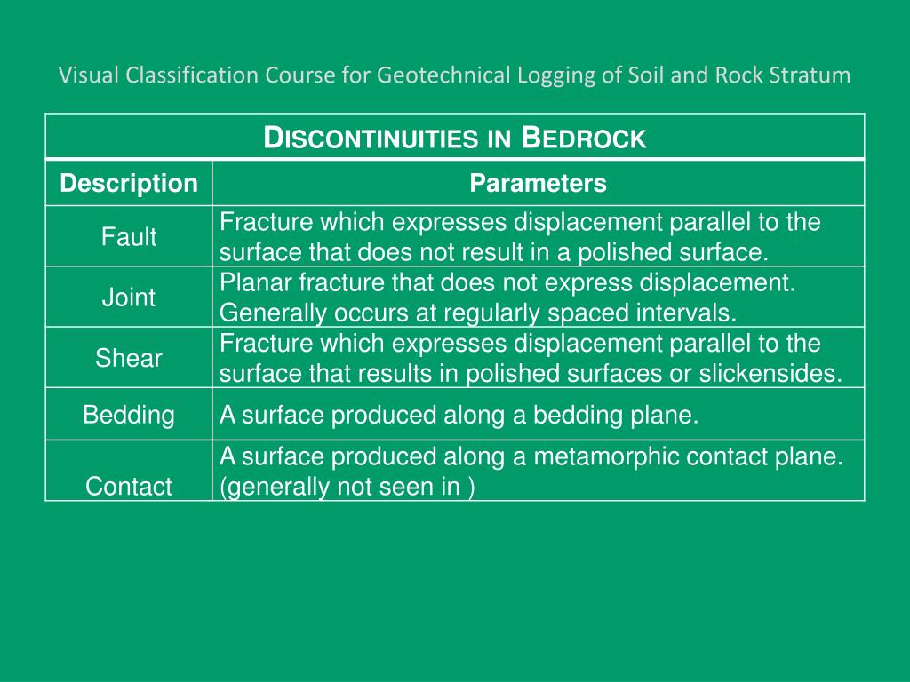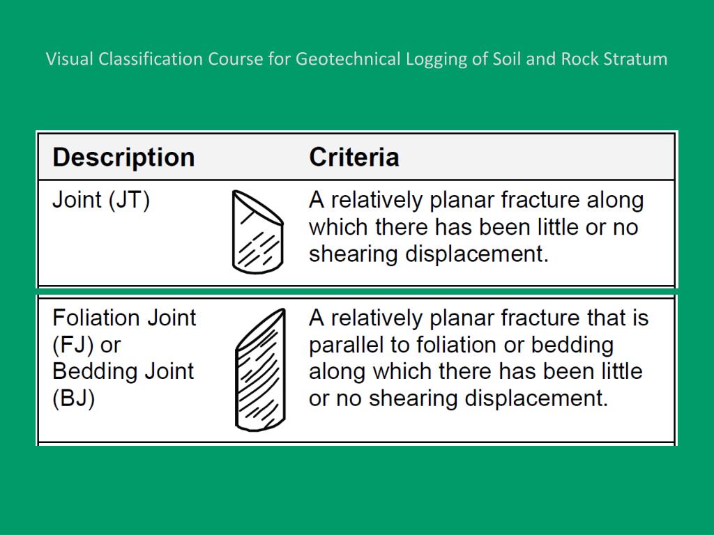 Visual Classification Course for Geotechnical Logging of Soil and Rock Stratum Descriptors: Use terms to describe secondary characteristics of bedrock as necessary. Use no more than three characteristics in the description.