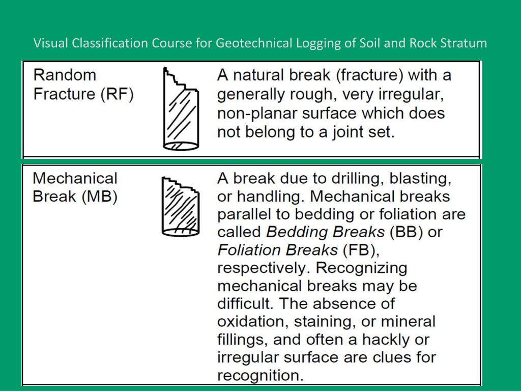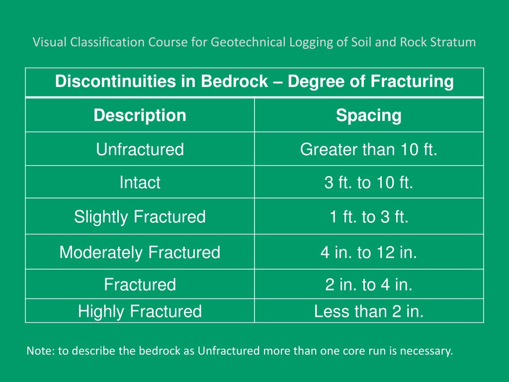 Visual Classification Course for Geotechnical Logging of Soil and Rock Stratum Note: to describe the bedrock as Unfractured more than one core run is necessary.