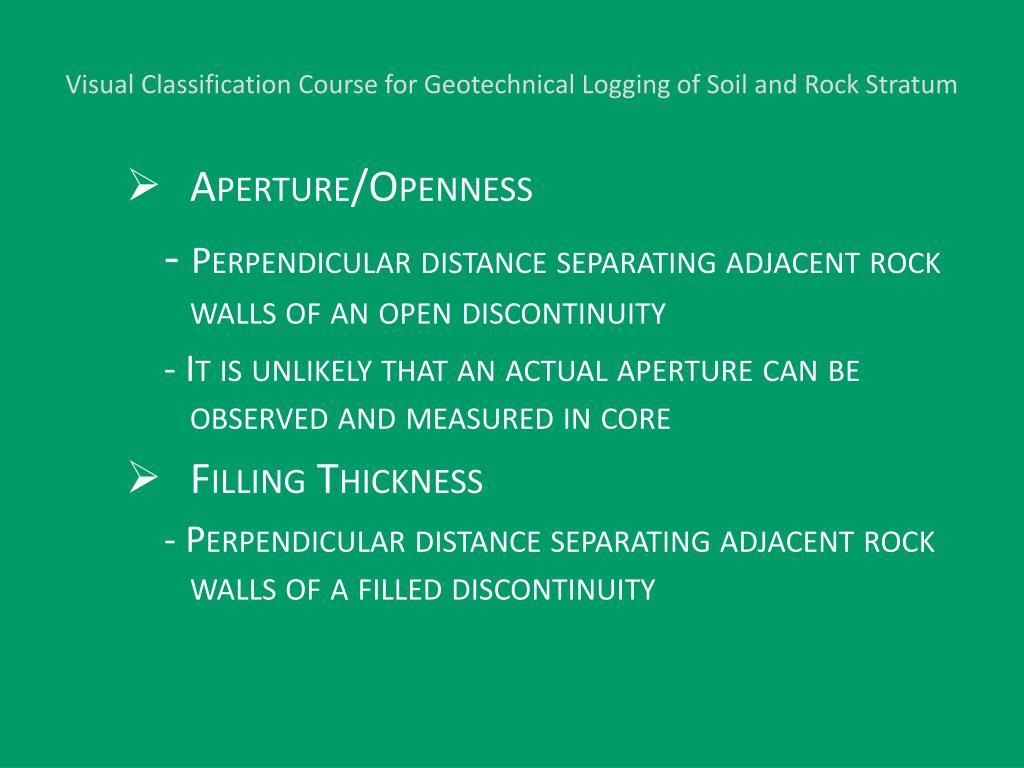 Visual Classification Course for Geotechnical Logging of Soil and Rock Stratum • Aperture/Openness - Perpendicular distance separating adjacent rock walls of an open discontinuity - It is unlikely that an actual aperture can be observed and measured in core • Filling Thickness - Perpendicular distance separating adjacent rock walls of a filled discontinuity