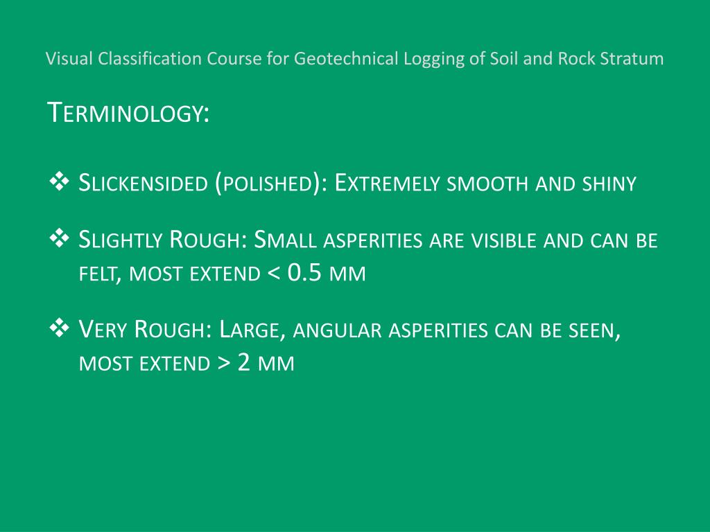 Visual Classification Course for Geotechnical Logging of Soil and Rock Stratum Terminology: • Slickensided (polished): Extremely smooth and shiny • Slightly Rough: Small asperities are visible and can be felt, most extend < 0.5 mm • Very Rough: Large, angular asperities can be seen, most extend > 2 mm