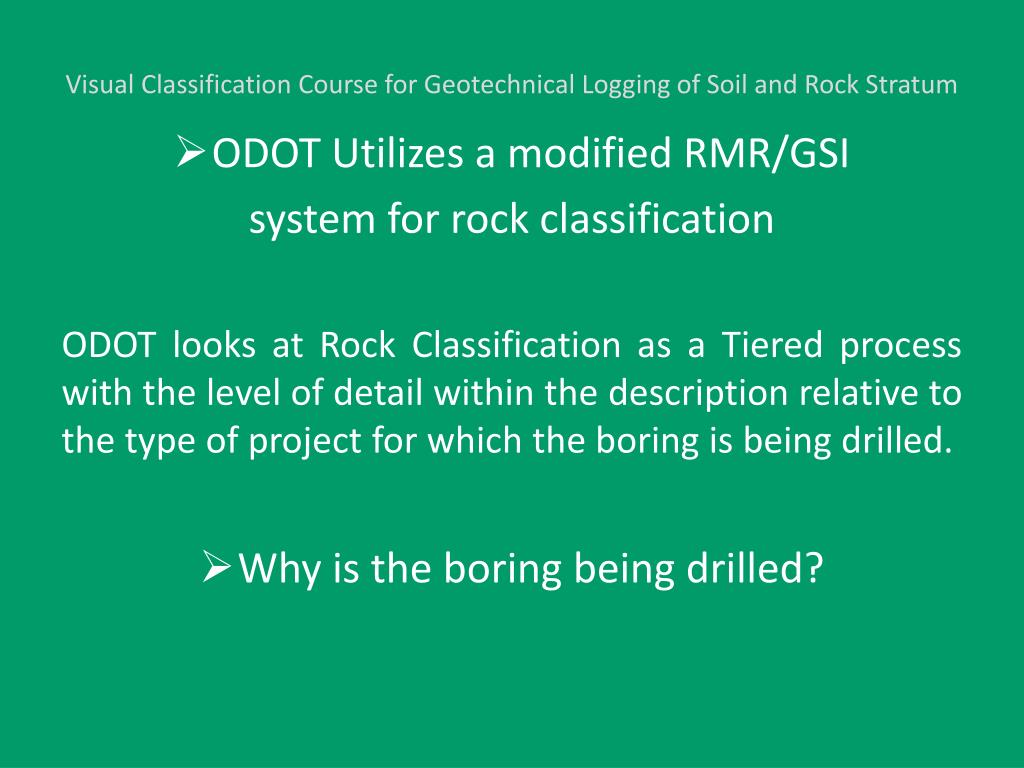 Visual Classification Course for Geotechnical Logging of Soil and Rock Stratum • ODOT Utilizes a modified RMR/GSI system for rock classification ODOT looks at Rock Classification as a Tiered process with the level of detail within the description relative to the type of project for which the boring is being drilled. • Why is the boring being drilled?