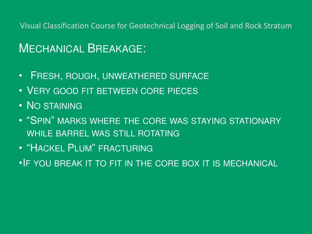 Visual Classification Course for Geotechnical Logging of Soil and Rock Stratum Mechanical Breakage: • Fresh, rough, unweathered surface • Very good fit between core pieces • No staining • “Spin” marks where the core was staying stationary while barrel was still rotating • “Hackel Plum” fracturing • If you break it to fit in the core box it is mechanical