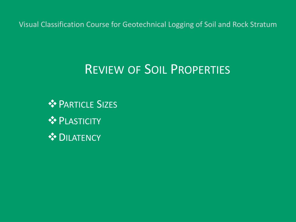 Visual Classification Course for Geotechnical Logging of Soil and Rock Stratum Review of Soil Properties • Particle Sizes • Plasticity • Dilatency