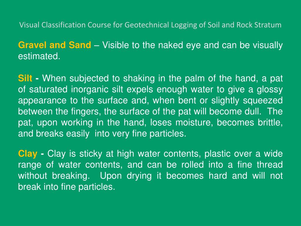 Visual Classification Course for Geotechnical Logging of Soil and Rock Stratum Gravel and Sand– Visible to the naked eye and can be visually estimated. Silt - When subjected to shaking in the palm of the hand, a pat of saturated inorganic silt expels enough water to give a glossy appearance to the surface and, when bent or slightly squeezed between the fingers, the surface of the pat will become dull. The pat, upon working in the hand, loses moisture, becomes brittle, and breaks easily into very fine particles. Clay - Clay is sticky at high water contents, plastic over a wide range of water contents, and can be rolled into a fine thread without breaking. Upon drying it becomes hard and will not break into fine particles.