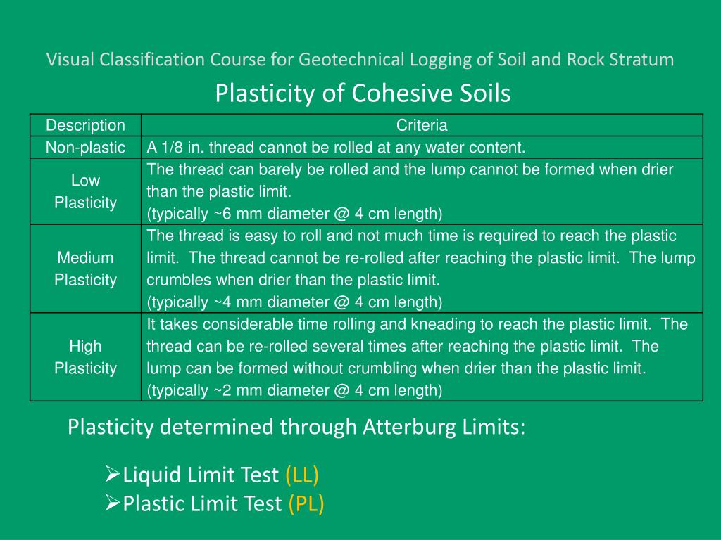 Visual Classification Course for Geotechnical Logging of Soil and Rock Stratum Plasticity of Cohesive Soils • Plasticity determined through Atterburg Limits: • Liquid Limit Test (LL) • Plastic Limit Test (PL)