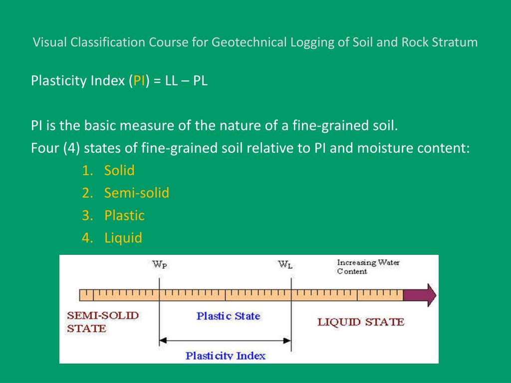 Visual Classification Course for Geotechnical Logging of Soil and Rock Stratum Plasticity Index (PI) = LL – PL PI is the basic measure of the nature of a fine-grained soil. Four (4) states of fine-grained soil relative to PI and moisture content: • Solid • Semi-solid • Plastic • Liquid