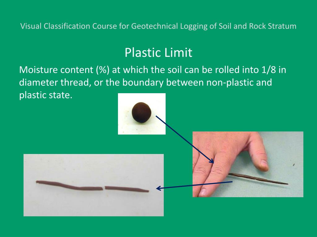 Visual Classification Course for Geotechnical Logging of Soil and Rock Stratum Plastic Limit Moisture content (%) at which the soil can be rolled into 1/8 in diameter thread, or the boundary between non-plastic and plastic state.