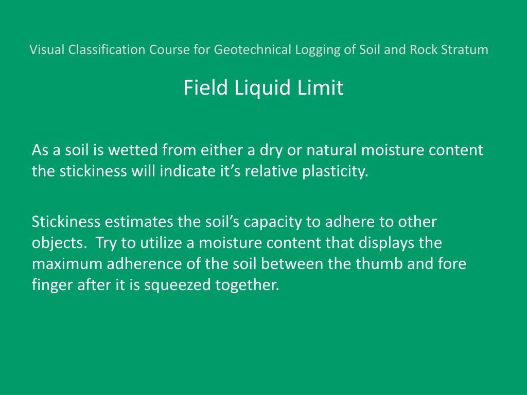 Visual Classification Course for Geotechnical Logging of Soil and Rock Stratum Field Liquid Limit As a soil is wetted from either a dry or natural moisture content the stickiness will indicate it’s relative plasticity. Stickiness estimates the soil’s capacity to adhere to other objects. Try to utilize a moisture content that displays the maximum adherence of the soil between the thumb and fore finger after it is squeezed together.