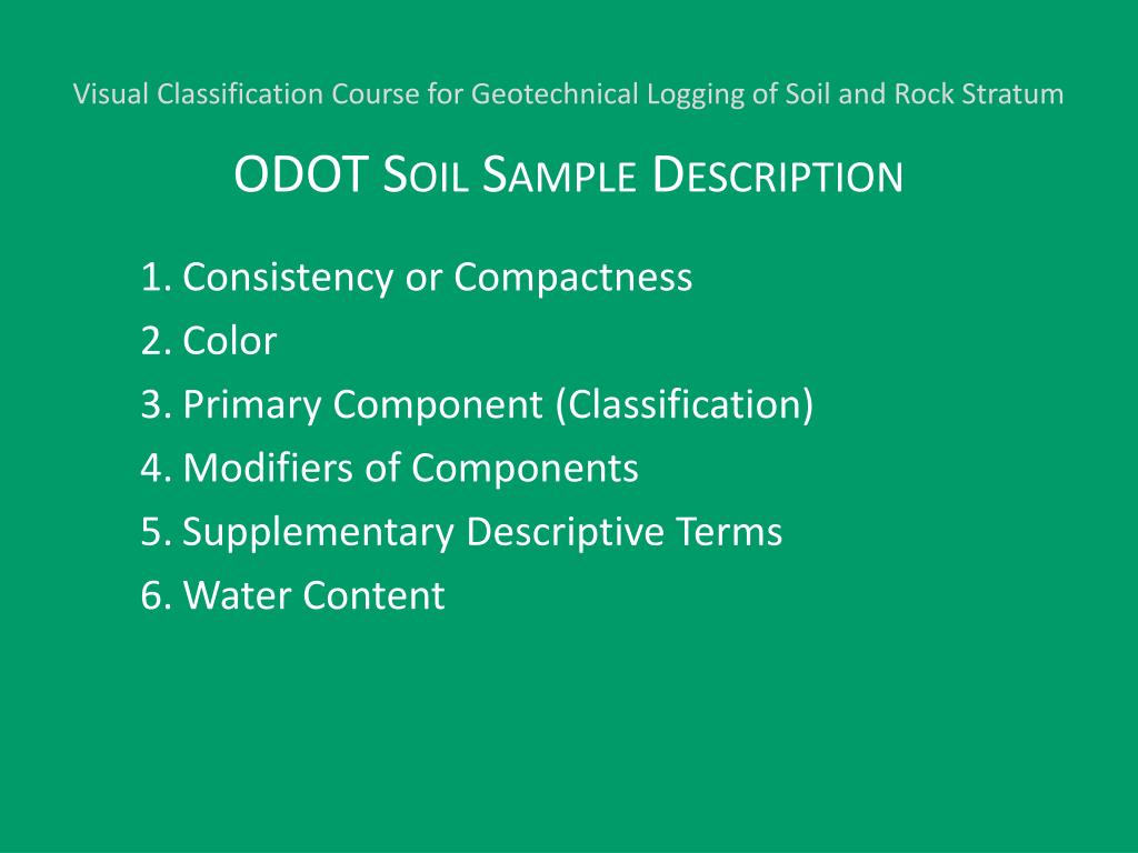 Visual Classification Course for Geotechnical Logging of Soil and Rock Stratum ODOT Soil Sample Description • Consistency or Compactness • Color • Primary Component (Classification) • Modifiers of Components • Supplementary Descriptive Terms • Water Content