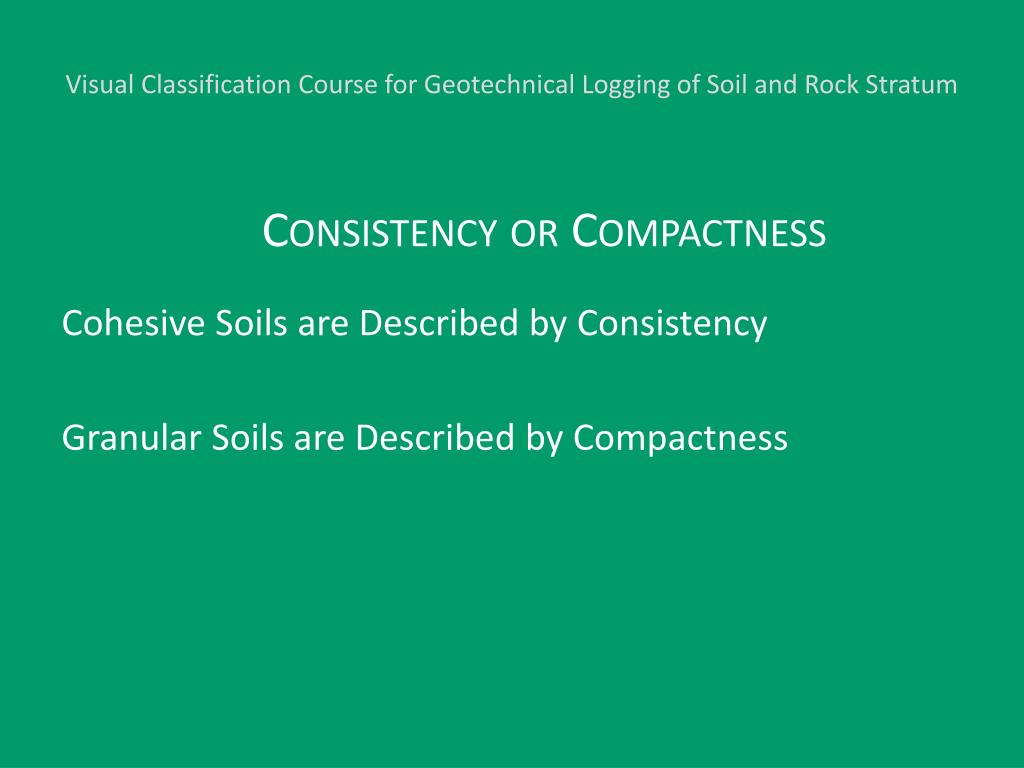 Visual Classification Course for Geotechnical Logging of Soil and Rock Stratum Consistency or Compactness Cohesive Soils are Described by Consistency Granular Soils are Described by Compactness