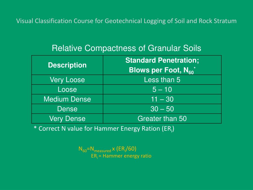 Visual Classification Course for Geotechnical Logging of Soil and Rock Stratum • N60=Nmeasuredx (ERi/60) • ERi= Hammer energy ratio