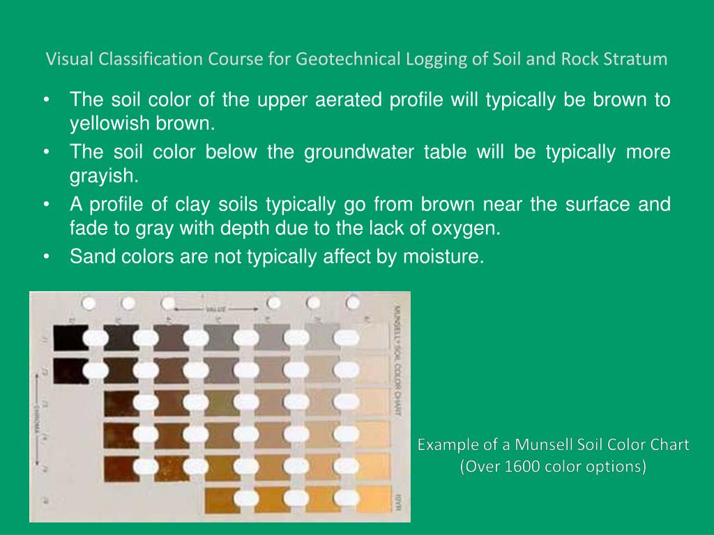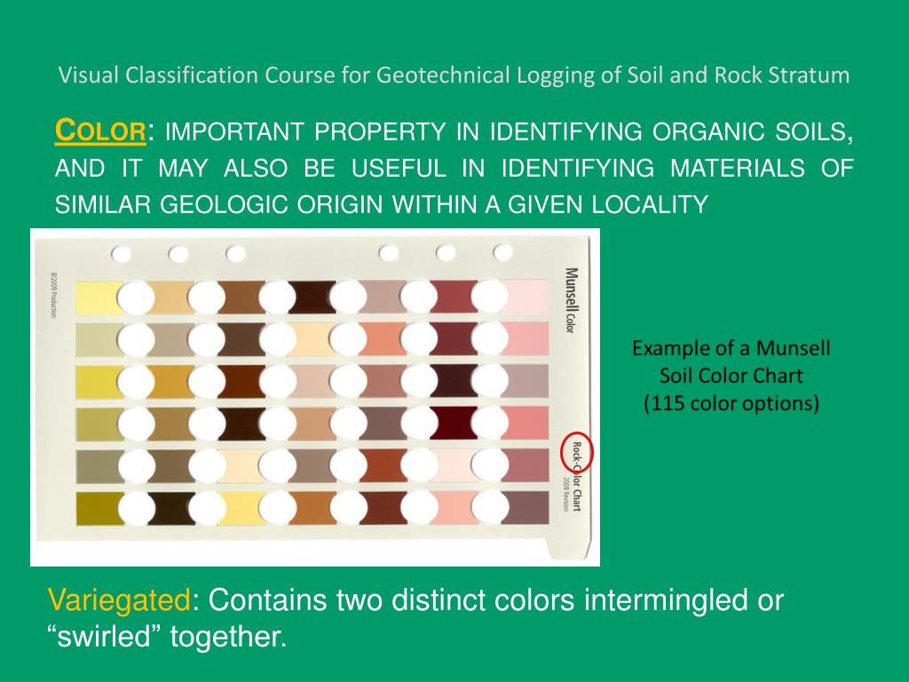 Visual Classification Course for Geotechnical Logging of Soil and Rock Stratum Color: important property in identifying organic soils, and it may also be useful in identifying materials of similar geologic origin within a given locality Variegated: Contains two distinct colors intermingled or “swirled” together.