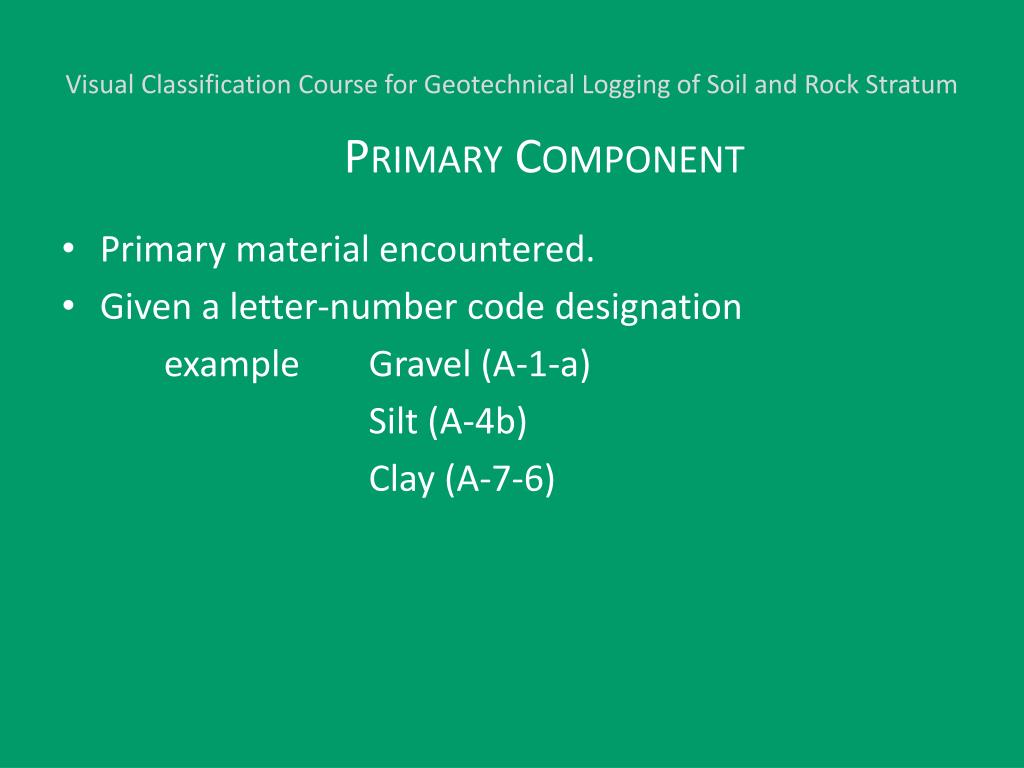 Visual Classification Course for Geotechnical Logging of Soil and Rock Stratum Primary Component • Primary material encountered. • Given a letter-number code designation example Gravel (A-1-a) Silt (A-4b) Clay (A-7-6)
