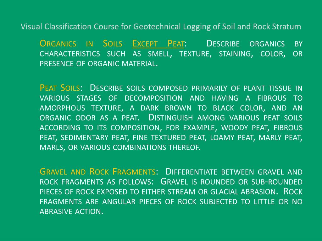 Visual Classification Course for Geotechnical Logging of Soil and Rock Stratum Organics in Soils Except Peat: Describe organics by characteristics such as smell, texture, staining, color, or presence of organic material. Peat Soils: Describe soils composed primarily of plant tissue in various stages of decomposition and having a fibrous to amorphous texture, a dark brown to black color, and an organic odor as a peat. Distinguish among various peat soils according to its composition, for example, woody peat, fibrous peat, sedimentary peat, fine textured peat, loamy peat, marly peat, marls, or various combinations thereof. Gravel and Rock Fragments: Differentiate between gravel and rock fragments as follows: Gravel is rounded or sub-rounded pieces of rock exposed to either stream or glacial abrasion. Rock fragments are angular pieces of rock subjected to little or no abrasive action.