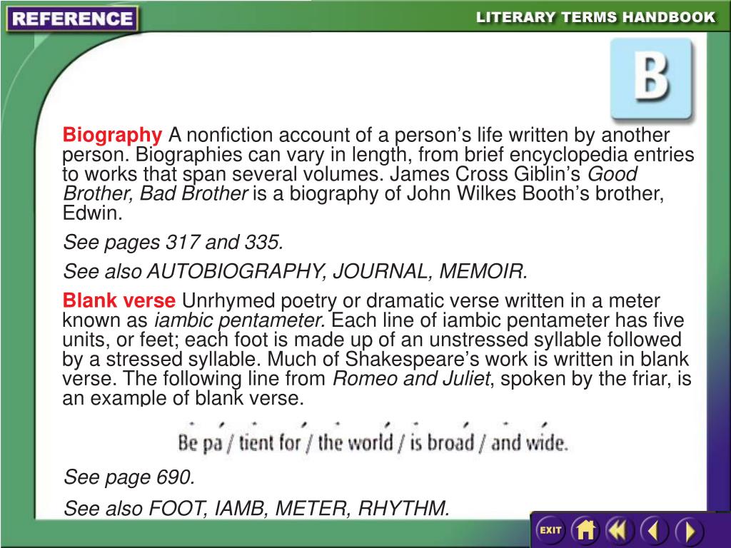 Biography A nonfiction account of a person’s life written by another person. Biographies can vary in length, from brief encyclopedia entries to works that span several volumes. James Cross Giblin’s Good Brother, Bad Brother is a biography of John Wilkes Booth’s brother, Edwin. See pages 317 and 335. See also AUTOBIOGRAPHY, JOURNAL, MEMOIR. Blank verse Unrhymed poetry or dramatic verse written in a meter known as iambic pentameter. Each line of iambic pentameter has five units, or feet; each foot is made up of an unstressed syllable followed by a stressed syllable. Much of Shakespeare’s work is written in blank verse. The following line from Romeo and Juliet, spoken by the friar, is an example of blank verse. See page 690. See also FOOT, IAMB, METER, RHYTHM. B-2
