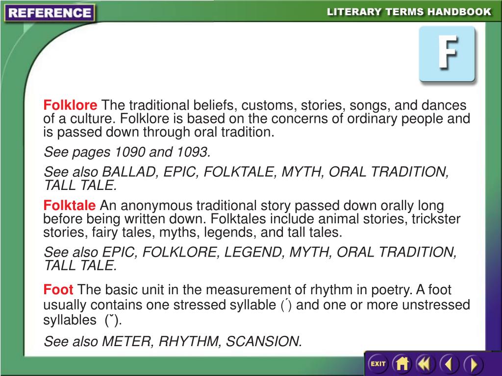 Folktale An anonymous traditional story passed down orally long before being written down. Folktales include animal stories, trickster stories, fairy tales, myths, legends, and tall tales. See also EPIC, FOLKLORE, LEGEND, MYTH, ORAL TRADITION, TALL TALE. Folklore The traditional beliefs, customs, stories, songs, and dances of a culture. Folklore is based on the concerns of ordinary people and is passed down through oral tradition. See pages 1090 and 1093. See also BALLAD, EPIC, FOLKTALE, MYTH, ORAL TRADITION, TALL TALE. Foot The basic unit in the measurement of rhythm in poetry. A foot usually contains one stressed syllable ( ́) and one or more unstressed syllables (ˇ). See also METER, RHYTHM, SCANSION. F-5