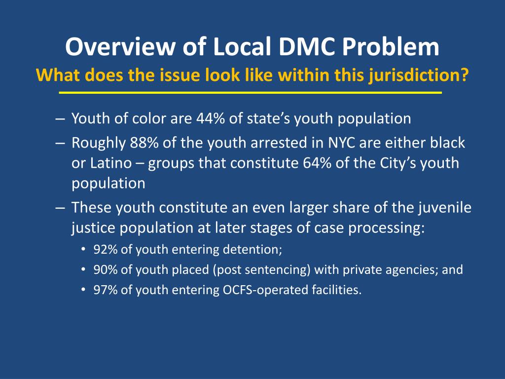 Overview of Local DMC ProblemWhat does the issue look like within this jurisdiction? • Youth of color are 44% of state’s youth population • Roughly 88% of the youth arrested in NYC are either black or Latino – groups that constitute 64% of the City’s youth population • These youth constitute an even larger share of the juvenile justice population at later stages of case processing: • 92% of youth entering detention; • 90% of youth placed (post sentencing) with private agencies; and • 97% of youth entering OCFS-operated facilities.