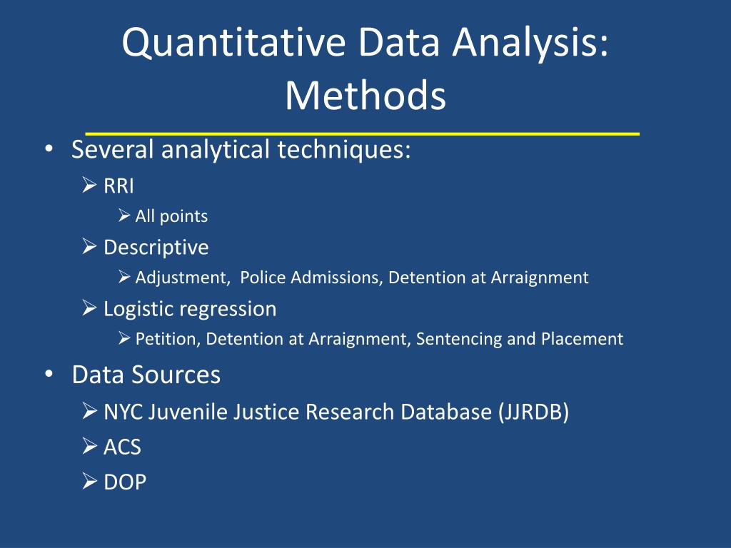 Quantitative Data Analysis: Methods • Several analytical techniques: • RRI • All points • Descriptive • Adjustment, Police Admissions, Detention at Arraignment • Logistic regression • Petition, Detention at Arraignment, Sentencing and Placement • Data Sources • NYC Juvenile Justice Research Database (JJRDB) • ACS • DOP