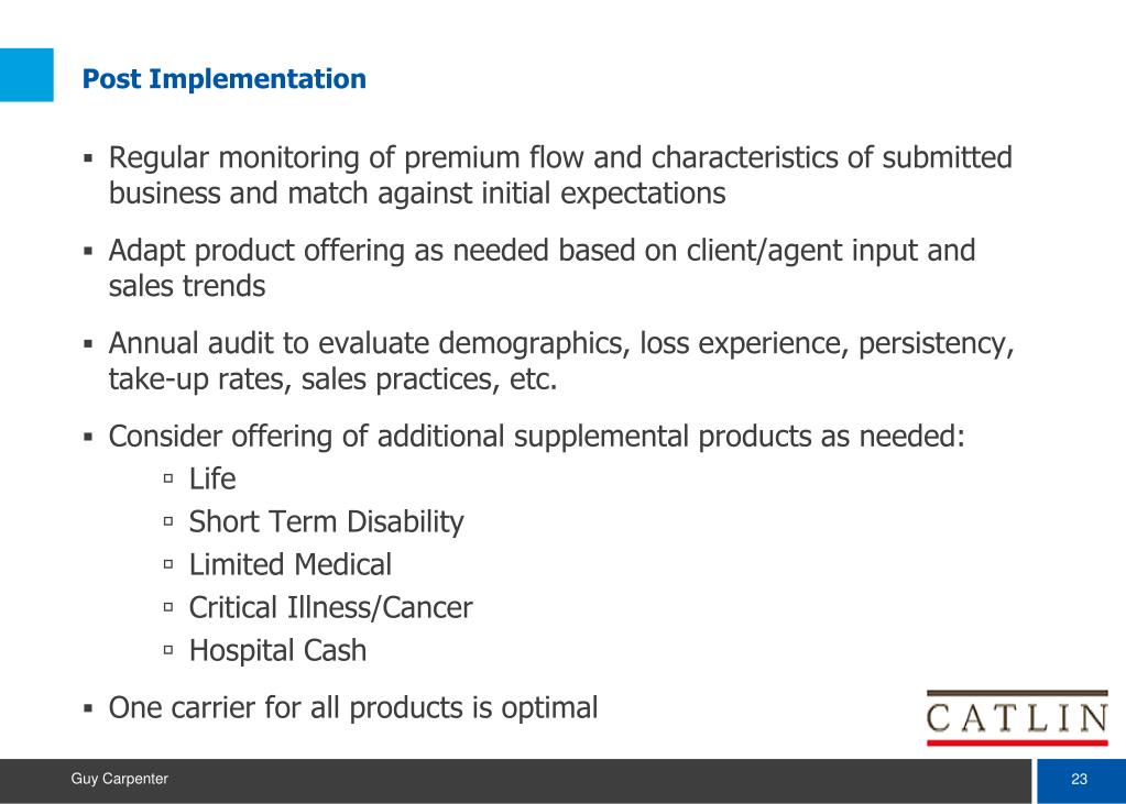 Post Implementation Regular monitoring of premium flow and characteristics of submitted business and match against initial expectations Adapt product offering as needed based on client/agent input and sales trends Annual audit to evaluate demographics, loss experience, persistency, take-up rates, sales practices, etc. Consider offering of additional supplemental products as needed: Life Short Term Disability Limited Medical Critical Illness/Cancer Hospital Cash One carrier for all products is optimal