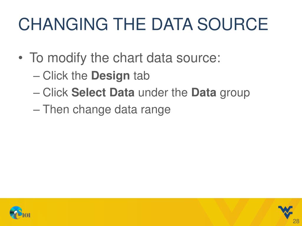 Changing the Data Source • To modify the chart data source: • Click the Design tab • Click Select Data under the Data group • Then change data range
