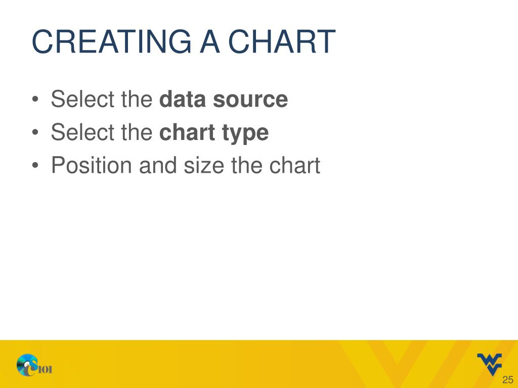 Creating a chart • Select the data source • Select the chart type • Position and size the chart