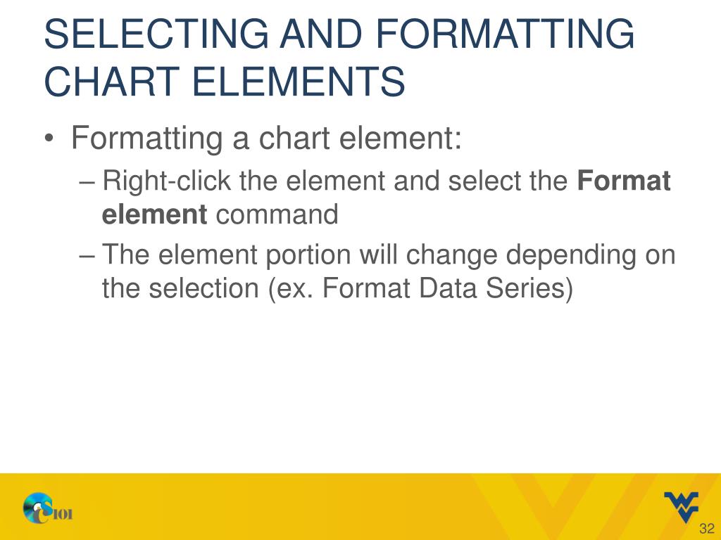 Selecting and Formatting Chart Elements • Formatting a chart element: • Right-click the element and select the Format element command • The element portion will change depending on the selection (ex. Format Data Series)
