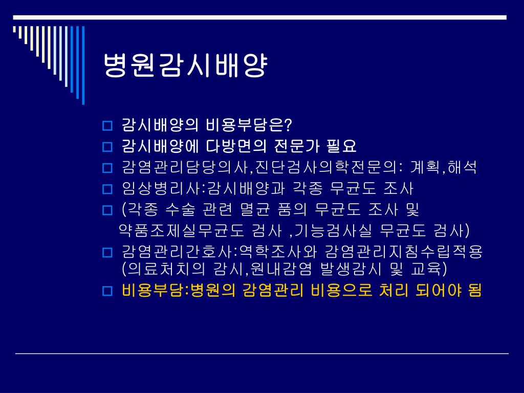 병원감시배양 • 감시배양의 비용부담은? • 감시배양에 다방면의 전문가 필요 • 감염관리담당의사,진단검사의학전문의: 계획,해석 • 임상병리사:감시배양과 각종 무균도 조사 • (각종 수술 관련 멸균 품의 무균도 조사 및 약품조제실무균도 검사 ,기능검사실 무균도 검사) • 감염관리간호사:역학조사와 감염관리지침수립적용(의료처치의 감시,원내감염 발생감시 및 교육) • 비용부담:병원의 감염관리 비용으로 처리 되어야 됨