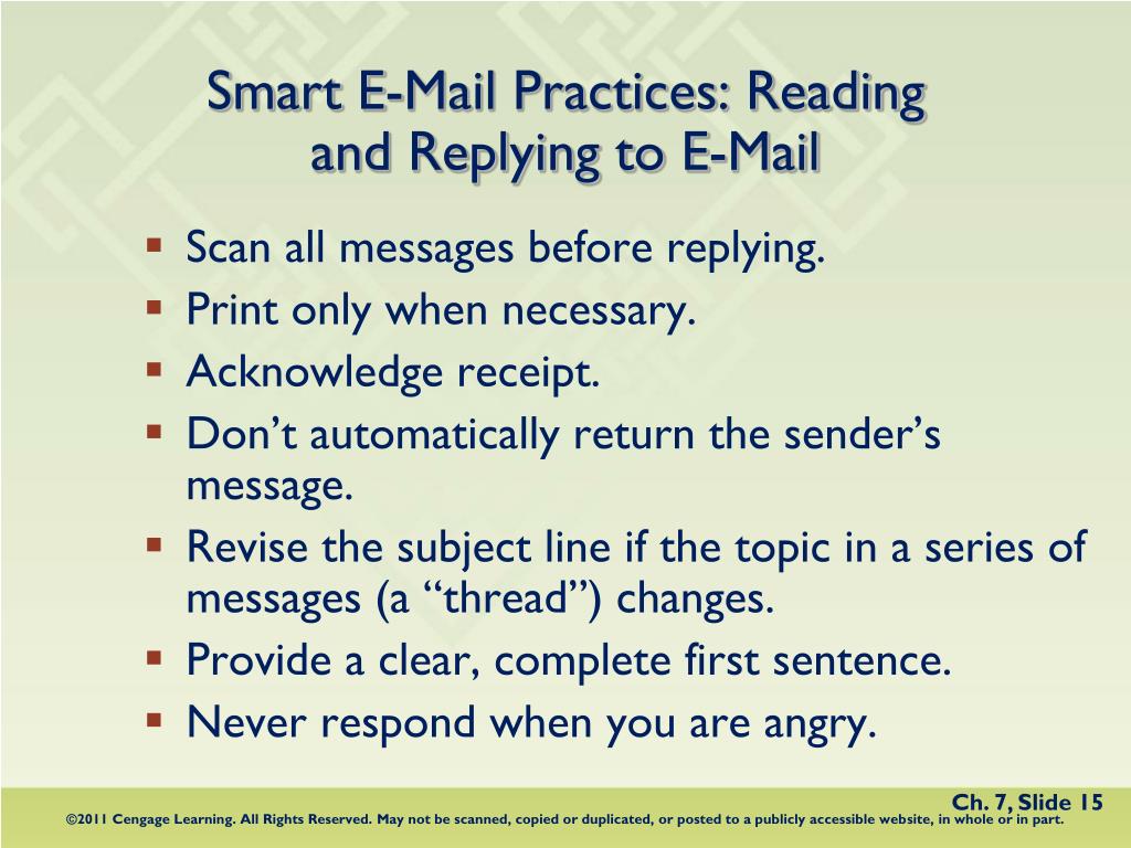 Smart E-Mail Practices: Readingand Replying to E-Mail • Scan all messages before replying. • Print only when necessary. • Acknowledge receipt. • Don’t automatically return the sender’s message. • Revise the subject line if the topic in a series of messages (a “thread”) changes. • Provide a clear, complete first sentence. • Never respond when you are angry.