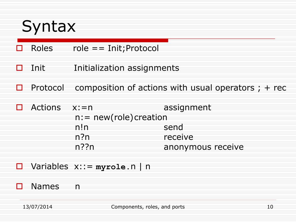 Syntax • Roles role == Init;Protocol • Init Initialization assignments • Protocol composition of actions with usual operators ; + rec • Actions x:=n assignment n:= new(role) creation n!n send n?n receive n??n anonymous receive • Variables x::= myrole.n | n • Names n Components, roles, and ports