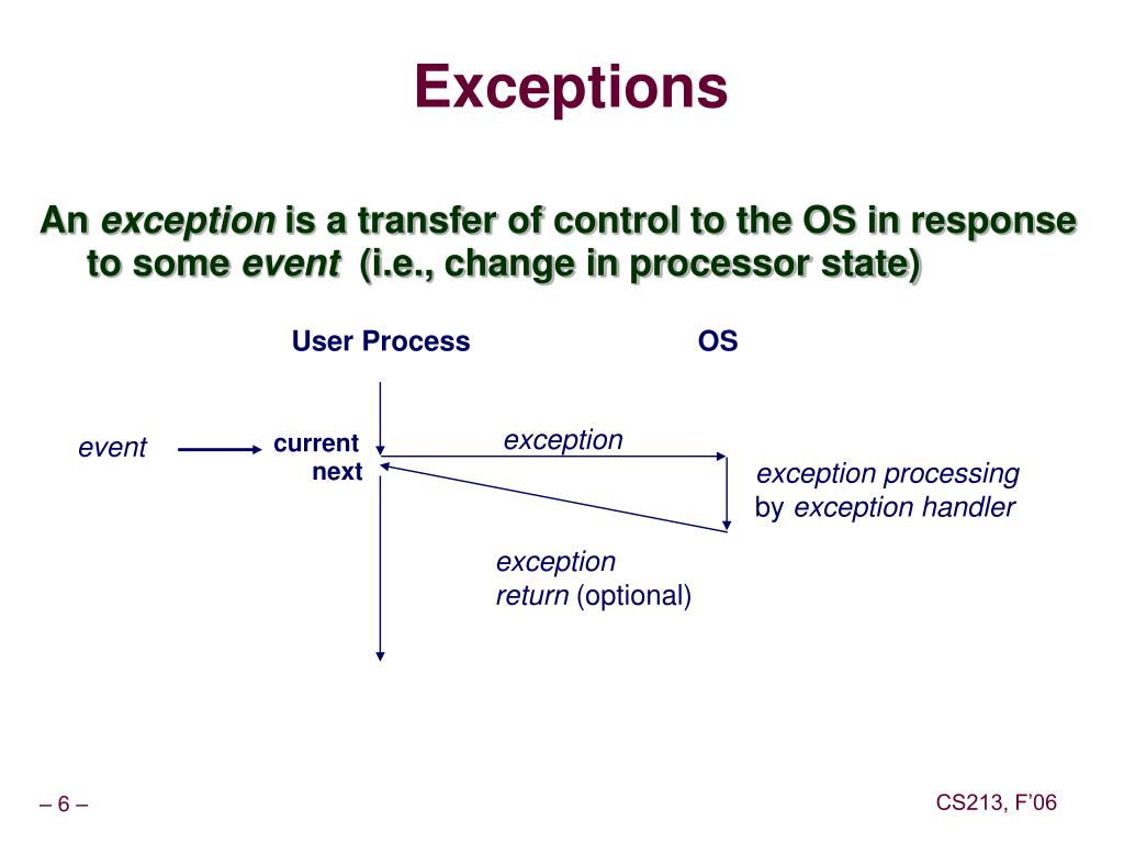 Exceptions • An exception is a transfer of control to the OS in response to some event (i.e., change in processor state) User Process OS exception current event next exception processing by exception handler exception return (optional)