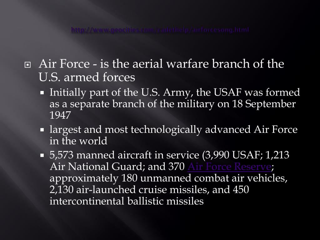http://www.geocities.com/cadethelp/airforcesong.html • Air Force - is the aerial warfare branch of the U.S. armed forces • Initially part of the U.S. Army, the USAF was formed as a separate branch of the military on 18 September 1947 • largest and most technologically advanced Air Force in the world • 5,573 manned aircraft in service (3,990 USAF; 1,213 Air National Guard; and 370 Air Force Reserve; approximately 180 unmanned combat air vehicles, 2,130 air-launched cruise missiles, and 450 intercontinental ballistic missiles