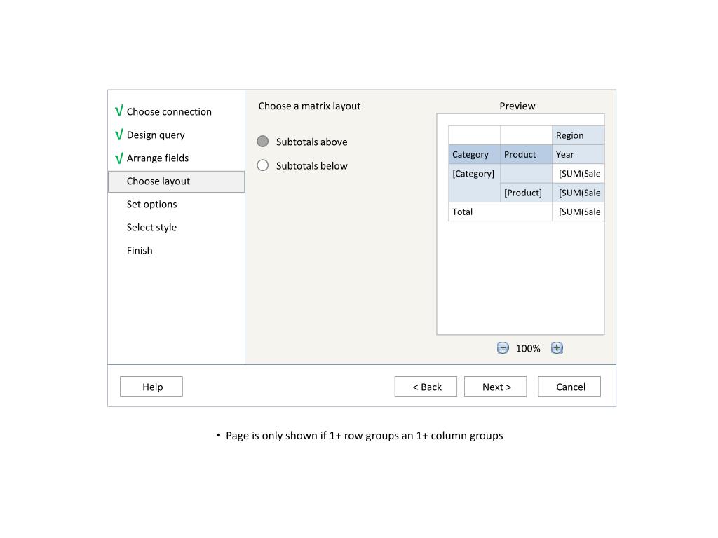 √ Choose a matrix layout Preview Choose connection Design query Arrange fields Choose layout Set options Select style Finish √ Subtotals above √ Subtotals below 100% Help < Back Next > Cancel • Page is only shown if 1+ row groups an 1+ column groups