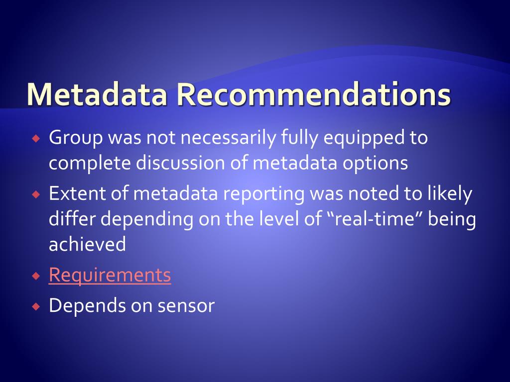 Metadata Recommendations • Group was not necessarily fully equipped to complete discussion of metadata options • Extent of metadata reporting was noted to likely differ depending on the level of “real-time” being achieved • Requirements • Depends on sensor