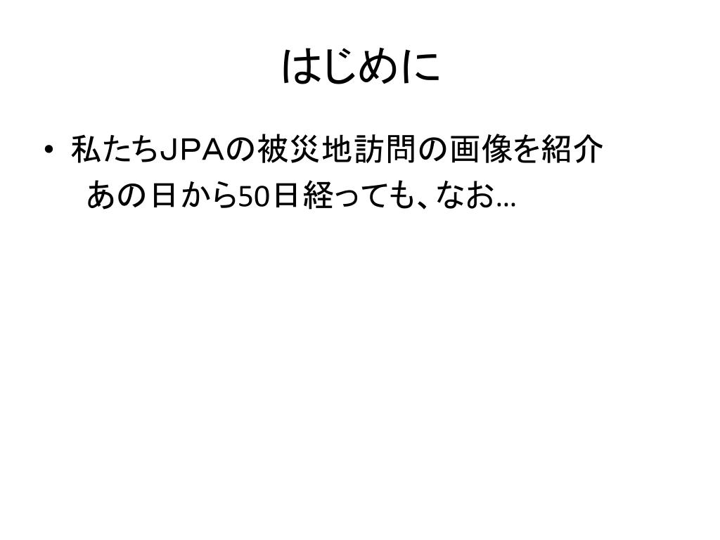 はじめに • 私たちJPAの被災地訪問の画像を紹介 あの日から50日経っても、なお…