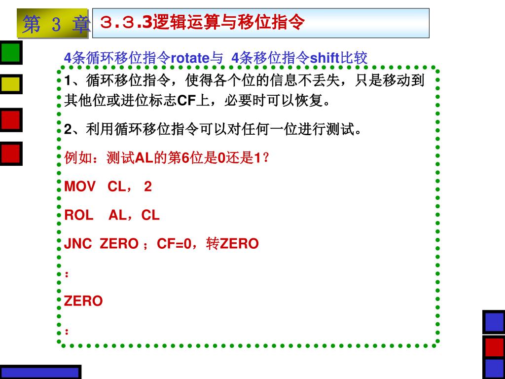 3.3.3逻辑运算与移位指令 4条循环移位指令rotate与 4条移位指令shift比较 1、循环移位指令,使得各个位的信息不丢失,只是移动到其他位或进位标志CF上,必要时可以恢复。 2、利用循环移位指令可以对任何一位进行测试。 例如:测试AL的第6位是0还是1? MOV CL, 2 ROL AL,CL JNC ZERO ;CF=0,转ZERO : ZERO :