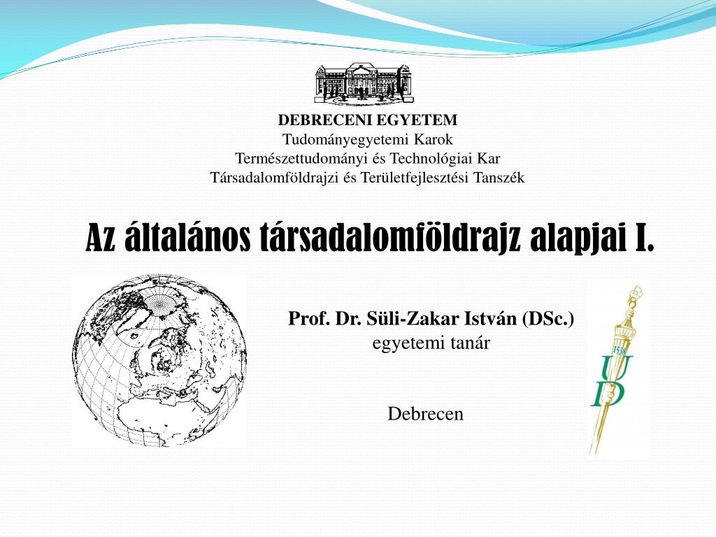 DEBRECENI EGYETEM Tudományegyetemi Karok Természettudományi és Technológiai Kar Társadalomföldrajzi és Területfejlesztési Tanszék Az általános társadalomföldrajz alapjai I. Prof. Dr. Süli-Zakar István (DSc.) egyetemi tanár Debrecen