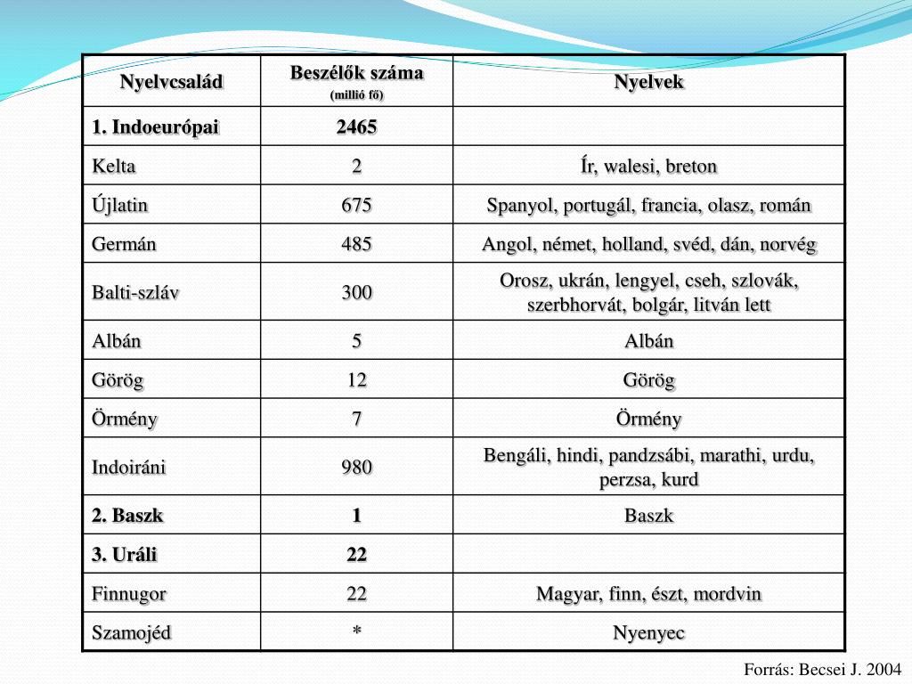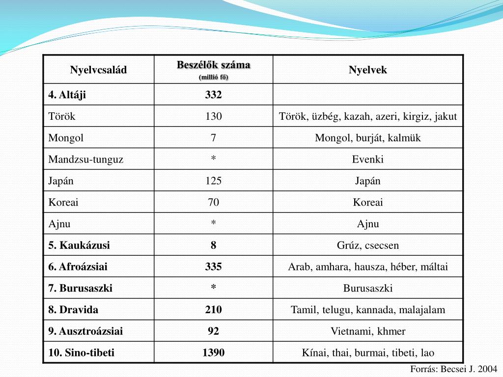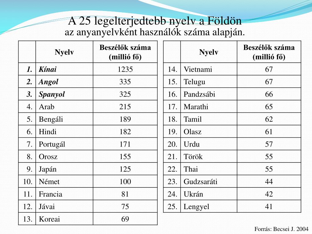 A 25 legelterjedtebb nyelv a Földön az anyanyelvként használók száma alapján. Forrás: Becsei J. 2004